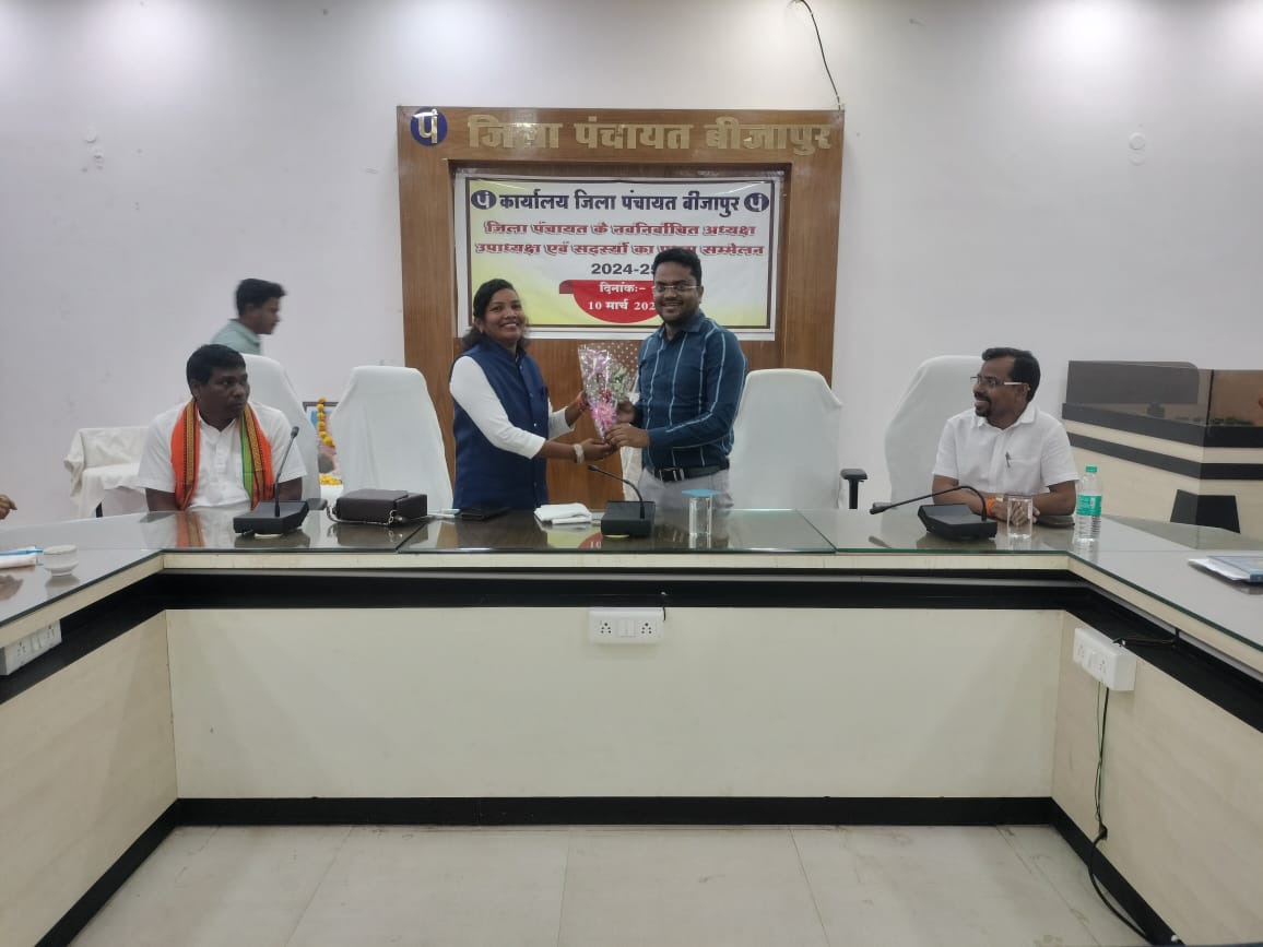 बीजापुर,,,,,,,,,,,,,,,,,,,,,,,,,,/ जिला पंचायत के नवनिर्वाचित अध्यक्ष , उपाध्यक्ष सहित सभी सदस्यों का प्रथम सम्मिलन जिला पंचायत में सम्पन्न हुआ। इस अवसर पर जिला पंचायत मुख्य कार्यपालन अधिकारी श्री हेमंत रमेश नंदनवार ने जिला पंचायत अध्यक्ष श्रीमती जानकी कोरसा उपाध्यक्ष श्री पेरे पुल्लैया सहित सभी सदस्यों को पुष्प गुच्छ भेंटकर अभिनंदन कर शुभकामनाएं दी।