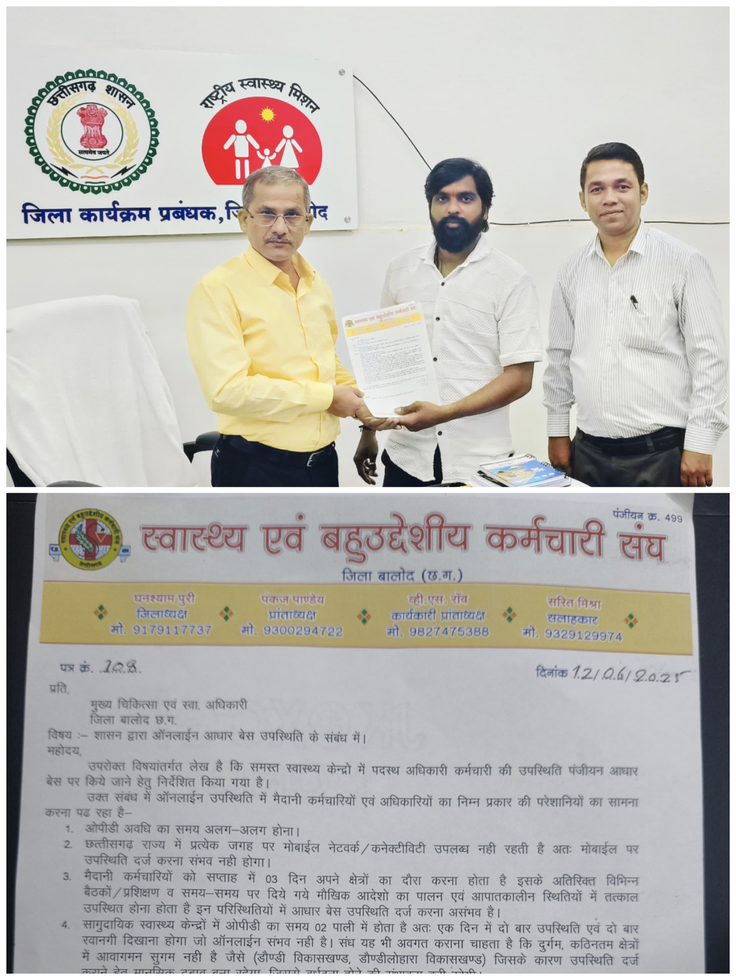 स्वास्थ्य एवं बहुद्देशीय कर्मचारी संघ ने आज मुख्य चिकित्सा एवं स्वास्थ्य अधिकारी कार्यालय बालोद में पहुंचकर आधार बेस ऑनलाइन उपस्थिति का विरोध कर ज्ञापन सौंपा।
