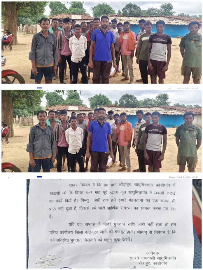 ओडाहुर साधुमिचगांव,कोडोगांव के लगभग 50 से 60भी अधिक मजदूरों से लकड़ी की कटाई का कार्य कराया गया है लेकिन छ: माह बाद भी मजदूरों को उनकी मजदूरी नहीं दी गयी है. मजदूर लगातार अधिकारियों से मजदूरी भुगतान की मांग करते आ रहे हैं. लेकिन अधिकारी बजट नहीं होने का हवाला देकर मजदूरों की मांग टालते आ रहे है. वन विभाग के चक्कर लगाकर थक चुके मजदूर अब कलेक्टर से मजदूरी दिलाने की गुहार लगा रहे हैं. मजदूरों का कहना है कि “उनका लगभग 15,,,,15 दिनो का मजदूरी भुगतान बाकी है. जिसके कारण हालत ऐसी है कि वो कर्ज लेकर अपने परिवार का भरण पोषण कर रहे हैं