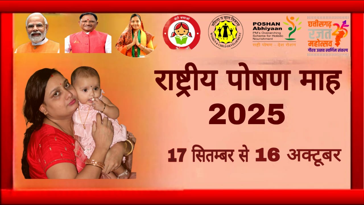 महासमुंद/सरायपाली :- छत्तीसगढ़ में राष्ट्रीय पोषण माह 17 सितंबर से शुरू होगा, जो 16 अक्टूबर तक चलेगा। राष्ट्रीय पोषण माह के लिए इस वर्ष के थीम में मोटापा घटाने हेतु चीनी व तेल का सीमित सेवन, प्रारंभिक बचपन की देखभाल एवं शिक्षा पोषण भी, पढ़ाई भी, शिशु एवं छोटे बच्चों की आहार पद्धतियां, बच्चों की देखभाल में पुरुषों की सक्रिय भागीदारी, स्थानीय पौष्टिक खाद्य संसाधनों को बढ़ावा आदि शामिल हैं।