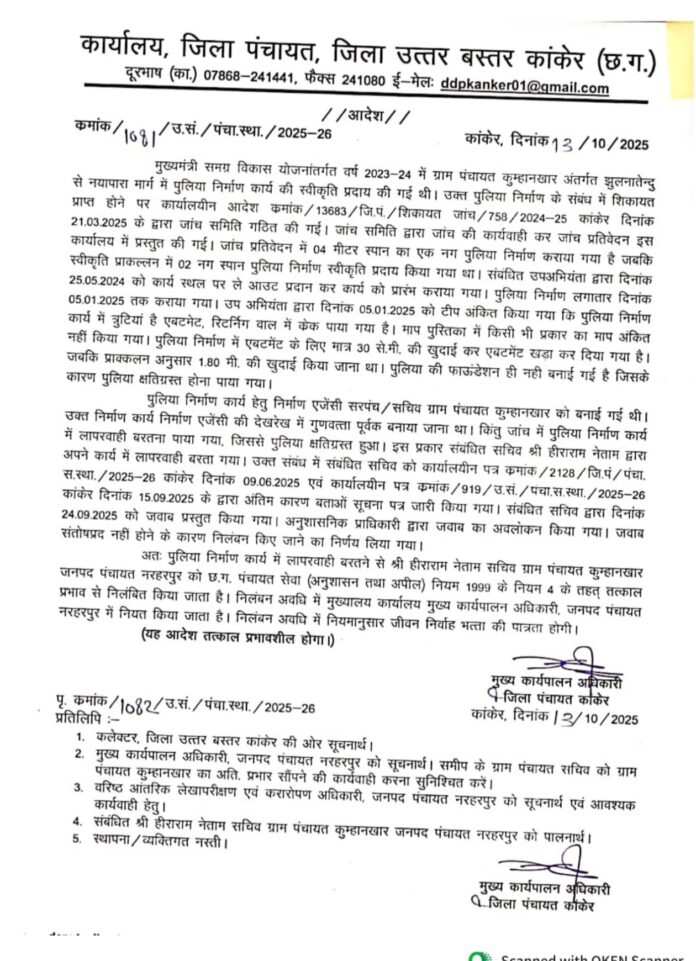 अतः पुलिया निर्माण कार्य में लापरवाही बरतने से हीराराम नेताम सचिव ग्राम पंचायत कुम्हानखार जनपद पंचायत नरहरपुर को छ.ग. पंचायत सेवा (अनुशासन तथा अपील) नियम 1999 के नियम 4 के तहत् तत्काल प्रभाव से निलंबित किया जाता है।