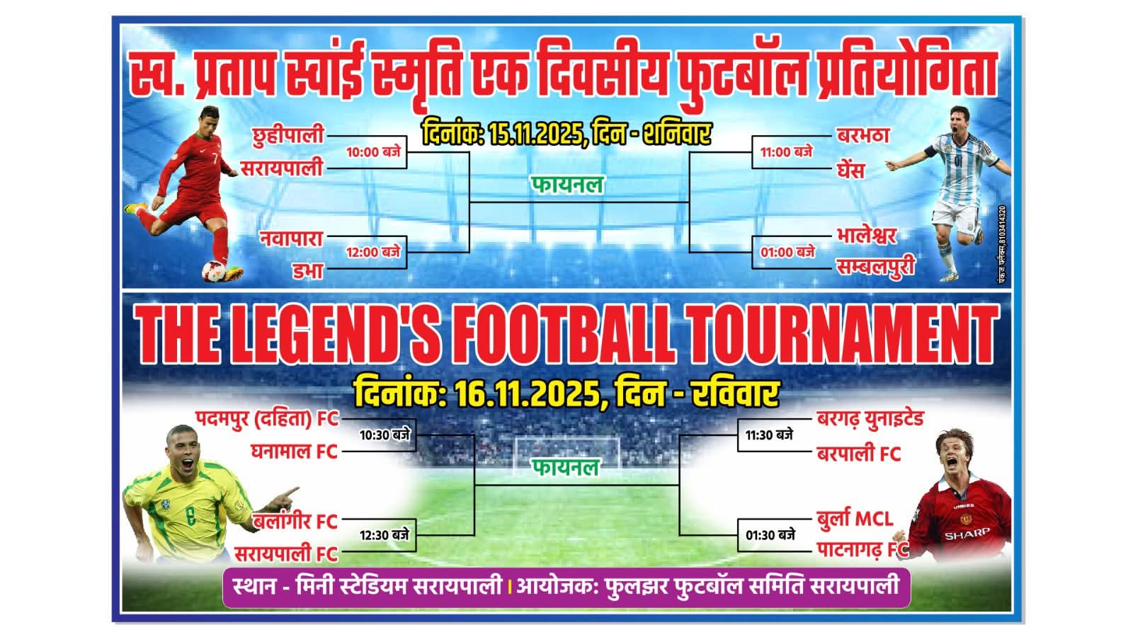 सरायपाली, (13 नवंबर 2025): खेल प्रेमियों के लिए एक शानदार खबर है। फुलझर फुटबॉल समिति, सरायपाली, इस सप्ताह के अंत में दो प्रमुख फुटबॉल टूर्नामेंट का आयोजन कर रही है। सरायपाली के मिनी स्टेडियम (हाई स्कूल मैदान) में स्व. प्रताप स्वाई स्मृति एक दिवसीय फुटबॉल प्रतियोगिता और प्रतिष्ठित ‘द लेजेंड्स फुटबॉल टूर्नामेंट’ में क्षेत्र की कई दमदार टीमें खिताब के लिए जोर आजमाइश करेंगी।