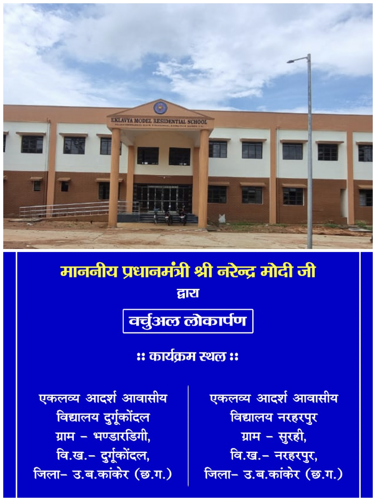 जनजातीय क्षेत्रों में गुणवत्तापूर्ण आवासीय शिक्षा उपलब्ध कराने की दिशा में भारत सरकार द्वारा संचालित एकलव्य आदर्श आवासीय विद्यालय (ईएमआरएस) योजना के तहत देशभर में नए विद्यालयों के संचालन में एक महत्वपूर्ण कदम उठाया जा रहा है। देश के माननीय प्रधानमंत्री द्वारा 15 नवम्बर 2025 (शनिवार) को दोपहर 1:00 वर्चुअल माध्यम से देश के 50 ईएमआरएस विद्यालयों का शिलान्यास तथा 42 ईएमआरएस विद्यालयों का उद्घाटन किया जाएगा। जिला कलेक्टर कार्यालय कांकेर से प्राप्त जानकारी केअनुसार इस कार्यक्रम में छत्तीसगढ़ राज्य के कांकेर जिले के दो विद्यालय भी शामिल हैं।