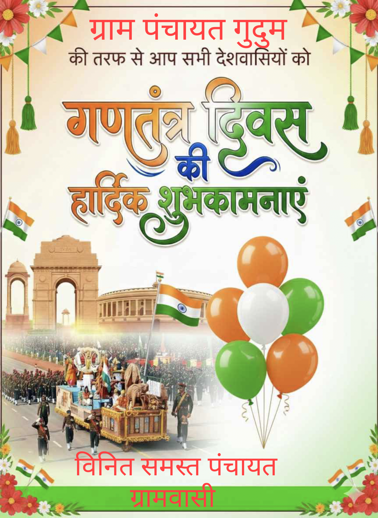 Kankerछत्तीसगढ़दुर्गूकोंदल ग्राम पंचायत गुदुम की ओर से समस्त देशवासियों को गणतंत्र दिवस की हार्दिक शुभकामनायें सरपंच – श्रीमती राम कुमारी पुडो सचिव – जगदेव पांडे उपसरपंच – श्रीमती मानको पुडो वार्ड पंच – अंकाल सिंह नुरुटी By Rkbharat news - 01/26/2026 0 34 FacebookXPinterestWhatsApp ग्राम पंचायत गुदुम की ओर से समस्त देशवासियों को गणतंत्र दिवस की हार्दिक शुभकामनायें सरपंच – श्रीमती राम कुमारी पुडो सचिव – जगदेव पांडे उपसरपंच – श्रीमती मानको पुडो वार्ड पंच – अंकाल सिंह नुरुटी