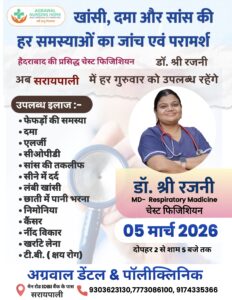 Uncategorized अग्रवाल नर्सिंग होम की सु प्रसिद्ध चेस्ट फिजिशियन डॉ श्री रजनी और न्यूरो एक्सपर्ट डॉ वैभव धवली जाँच एवं परामर्श के लिए आज सरायपाली मे रहेंगे उपलब्ध..। By Rahul Bhoi - 03/05/2026 0 9 FacebookTwitterPinterestWhatsApp