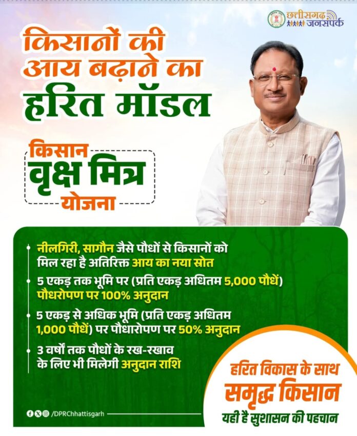 इस छत्तीसगढ़ सरकार की योजना का नाम *किसान वृक्ष मित्र योजना* है, जो *हरित मॉडल* के तहत किसानों की आय बढ़ाने के लिए शुरू की गई है। इसके मुख्य बिंदु हैं: