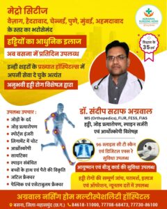 मेट्रो सिटीज विजाग हैदराबाद चेन्नई पुणे मुंबई अहमदाबाद के स्तर का भरोसेमंद. हड्डियों का आधुनिक इलाज अब बसना में प्रतिदिन उपलब्ध.. इन्हीं शहरों के प्रख्यात अस्पताल में अपनी सेवा दे चुके अत्यंत अनुभवी हड्डी रोग विशेषज्ञ डॉक्टर संदीप सराफ अग्रवाल द्वारा प्रतिदिन होती है मरीजों का ईलाज..