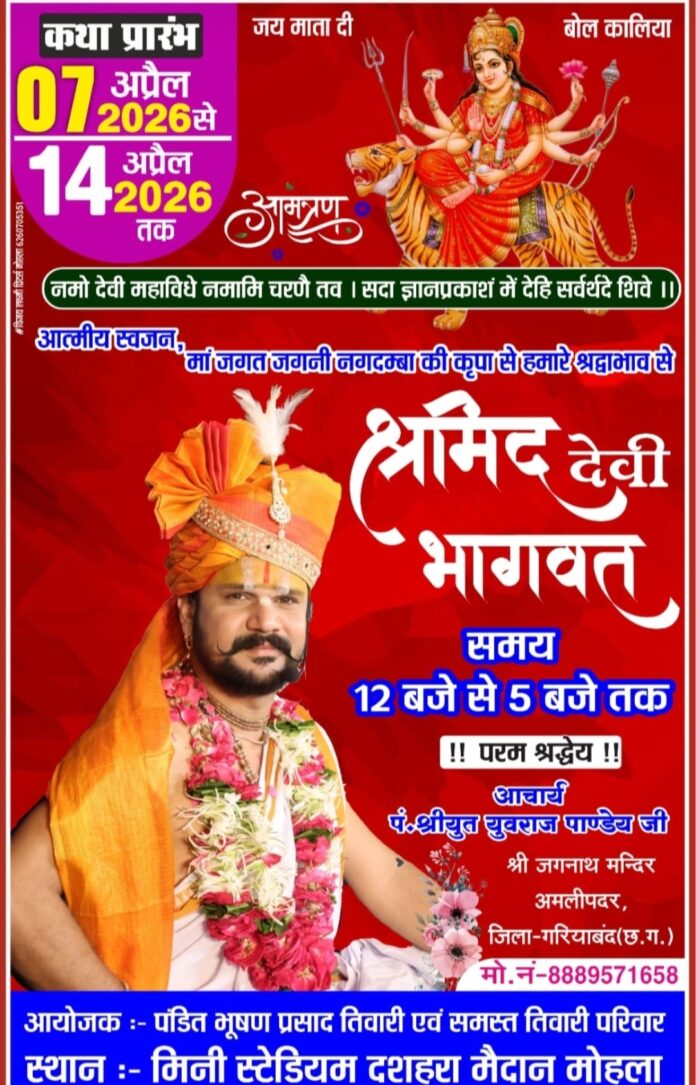 मोहला —नवरात्रि पर्व के शुभ अवसर पर मोहला में *श्रीमद् देवी भागवत कथा महोत्सव* का भव्य आयोजन 7 अप्रैल 2026 से प्रारंभ होने जा रहा है। मिनी स्टेडियम परिसर में आयोजित इस सात दिवसीय दिव्य कथा में बड़ी संख्या में श्रद्धालुओं के शामिल होने की संभावना है मुख्य आयोजनकर्ता **भूषण प्रसाद तिवारी** ने बताया कि 7 अप्रैल को विधिवत *कलश यात्रा और मंगलाचरण* के साथ कथा का शुभारंभ होगा। कार्यक्रम प्रतिदिन आध्यात्मिक उल्लास और धार्मिक ऊर्जा का अनुभव कराएगा।