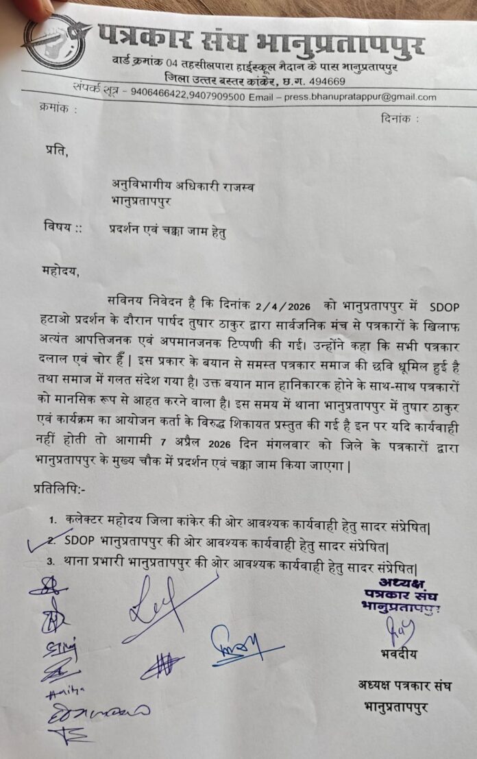 पत्रकार संघ भानुप्रतापपुर ने पार्षद तुषार ठाकुर द्वारा पत्रकारों के खिलाफ की गई आपत्तिजनक टिप्पणी को लेकर कड़ी आपत्ति जताई है। इस संबंध में अनुविभागीय अधिकारी (राजस्व) भानुप्रतापपुर को ज्ञापन सौंपकर उचित कार्रवाई की मांग की गई है। ज्ञापन में उल्लेख किया गया है कि दिनांक 2 अप्रैल 2026 को आयोजित एसडीओपी हटाओ प्रदर्शन के दौरान पार्षद तुषार ठाकुर ने सार्वजनिक मंच से पत्रकारों के विरुद्ध अत्यंत अपमानजनक शब्दों का प्रयोग करते हुए उन्हें “दलाल एवं चोर” कहा। इस बयान से पत्रकार समाज की छवि धूमिल हुई है तथा समाज में गलत संदेश गया है