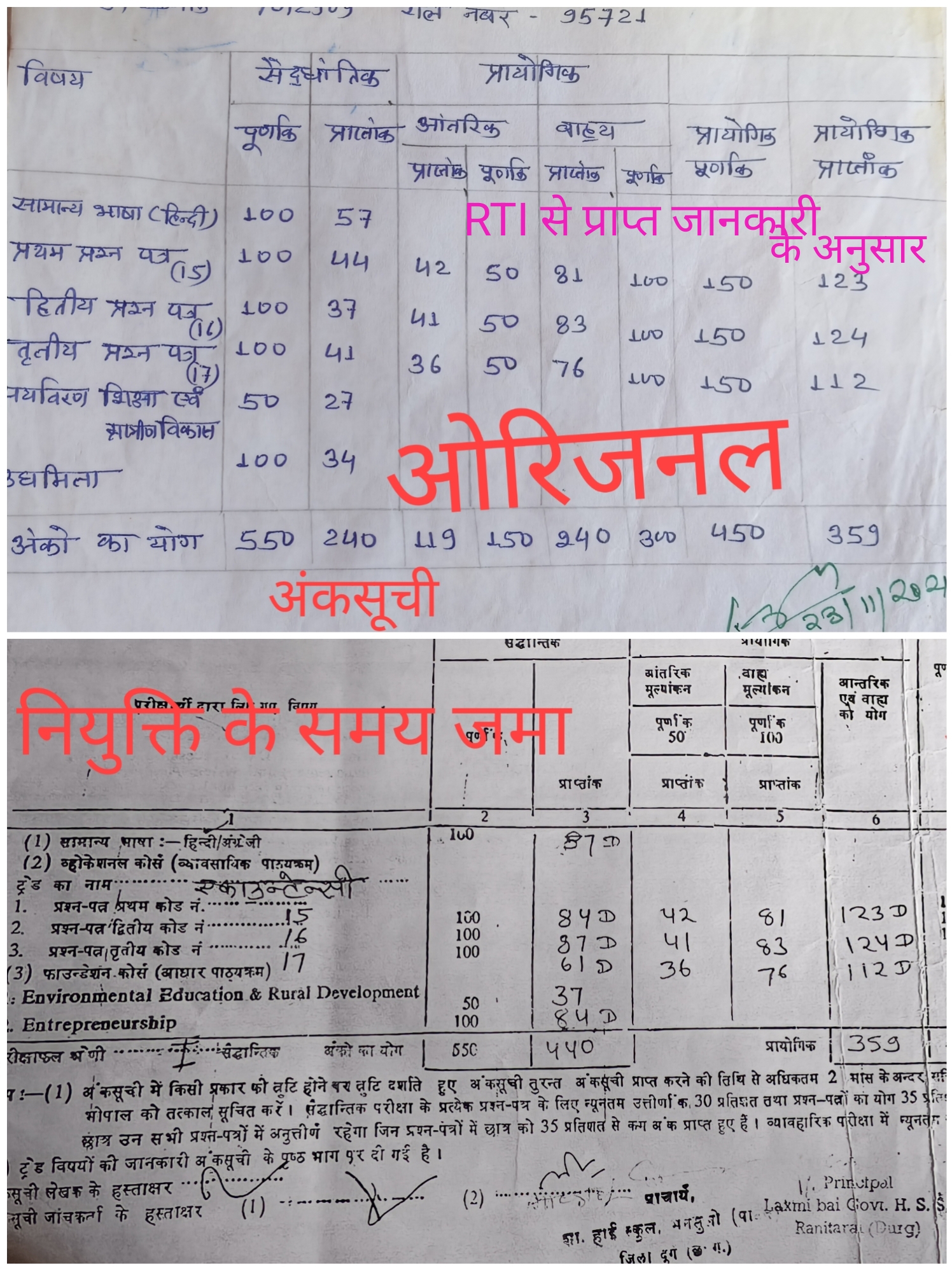 RTI के अनुसार, संबंधित शिक्षक पूर्व में दुर्ग जिले के धमधा ब्लॉक में भी पदस्थ रह चुके हैं। RTI से प्राप्त अंकसूची की प्रतियों में अंकों के साथ छेड़छाड़ और ओवरराइटिंग दिखाई दे रही है, जिससे पूरे मामले पर सवाल खड़े हो गए हैं।