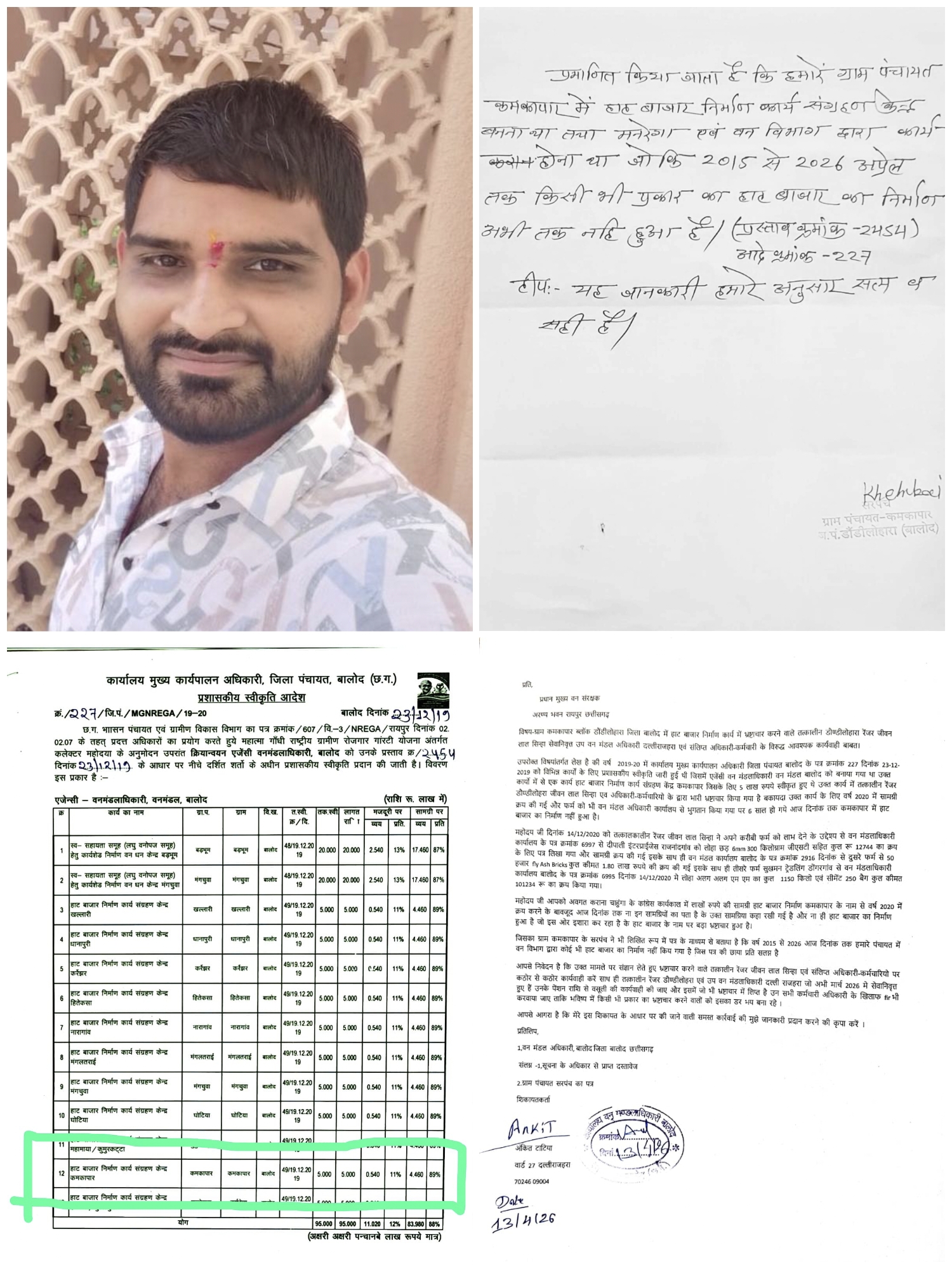 शिकायत के अनुसार वर्ष 2019-20 में जिला पंचायत बालोद के पत्र क्रमांक 227 दिनांक 23-12-2019 से ग्राम कमकापार, ब्लॉक डौंडीलोहारा में हाट बाजार निर्माण के लिए 5 लाख रुपये की प्रशासकीय स्वीकृति जारी हुई थी। एजेंसी वन मंडलाधिकारी बालोद को बनाया गया था।
