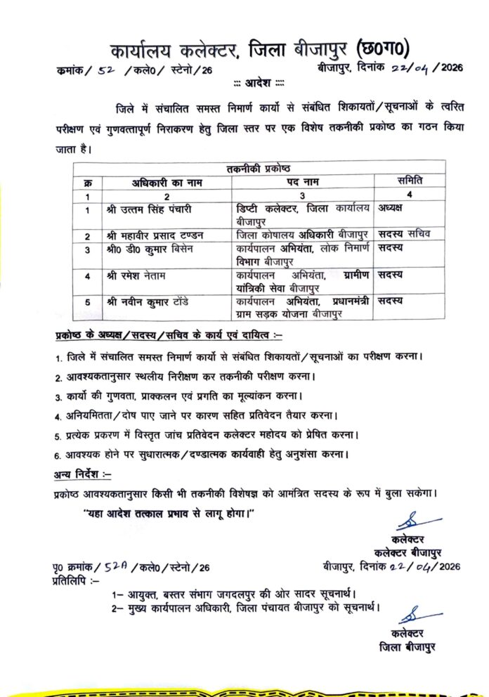 बीजापुर,,,,,,,,,,,,,,,,,,,,- जिले में संचालित समस्त निर्माण कार्यों से संबंधित शिकायतों एवं सूचनाओं के त्वरित परीक्षण तथा गुणवत्तापूर्ण निराकरण सुनिश्चित करने के उद्देश्य से जिला स्तर पर एक विशेष तकनीकी प्रकोष्ठ का गठन किया गया है। यह प्रकोष्ठ निर्माण कार्यों की गुणवत्ता, प्रगति और पारदर्शिता की निगरानी करेगा। प्रकोष्ठ की अध्यक्षता डिप्टी कलेक्टर श्री उत्तम सिंह पंचारी करेंगे। वहीं, जिला कोषालय अधिकारी श्री महावीर प्रसाद टण्डन को सदस्य सचिव बनाया गया है। इसके अतिरिक्त लोक निर्माण विभाग के कार्यपालन अभियंता श्री डी.कुमार बिसेन, ग्रामीण यांत्रिकी सेवा के कार्यपालन अभियंता श्री रमेश नेताम तथा प्रधानमंत्री ग्राम सड़क योजना के कार्यपालन अभियंता श्री नवीन कुमार टोंडे को सदस्य के रूप में शामिल किया गया है।
