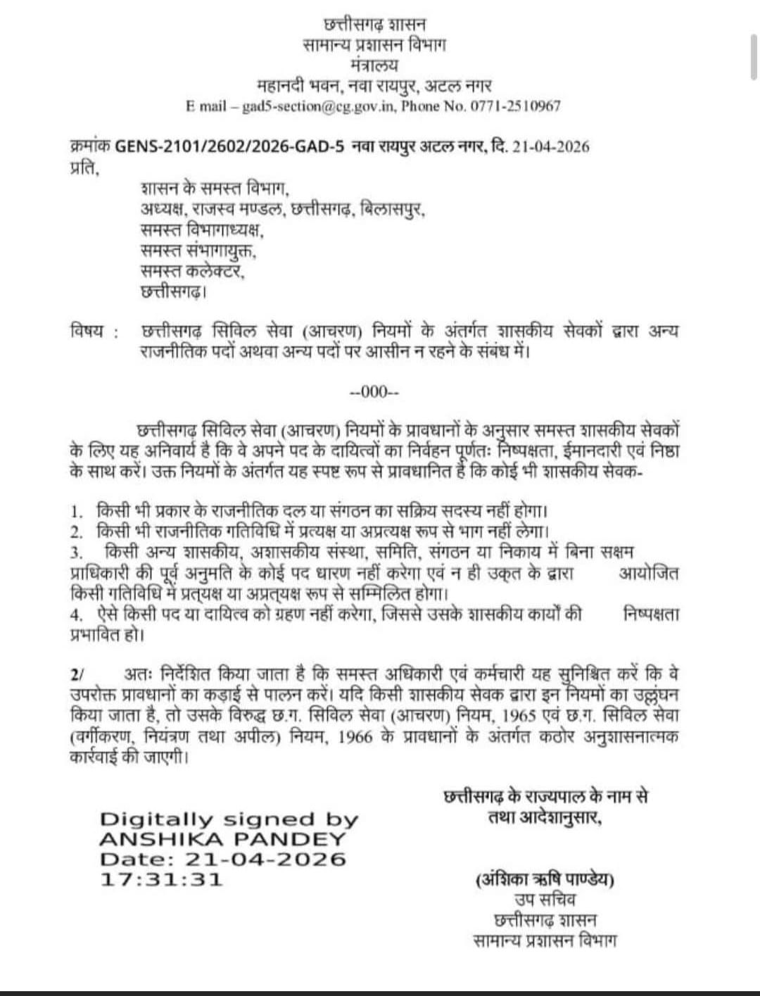 छत्तीसगढ़ शासन के सामान्य प्रशासन विभाग (GAD) द्वारा जारी एक महत्वपूर्ण आदेश में सभी शासकीय सेवकों के लिए सख्त दिशा-निर्देश जारी किए गए हैं। इस आदेश के तहत स्पष्ट किया गया है कि कोई भी सरकारी कर्मचारी किसी भी राजनीतिक दल या संगठन का सक्रिय सदस्य नहीं बन सकता और न ही किसी प्रकार की राजनीतिक गतिविधियों में प्रत्यक्ष या अप्रत्यक्ष रूप से भाग ले सकता है।