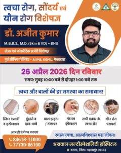अग्रवाल नर्सिंग होम बसना मे कल 26 अप्रेल दिन रविवार को सुबह 10 बजे से दोपहर 01 बजे तक त्वचा रोग सौदर्य एवं यौन रोग विशेषज्ञ डॉक्टर अजित कुमार रहेंगे उपलब्ध जहाँ वह त्वचा एवं बालो से सम्बंधित हर समस्याओ का समाधान करेंगे..