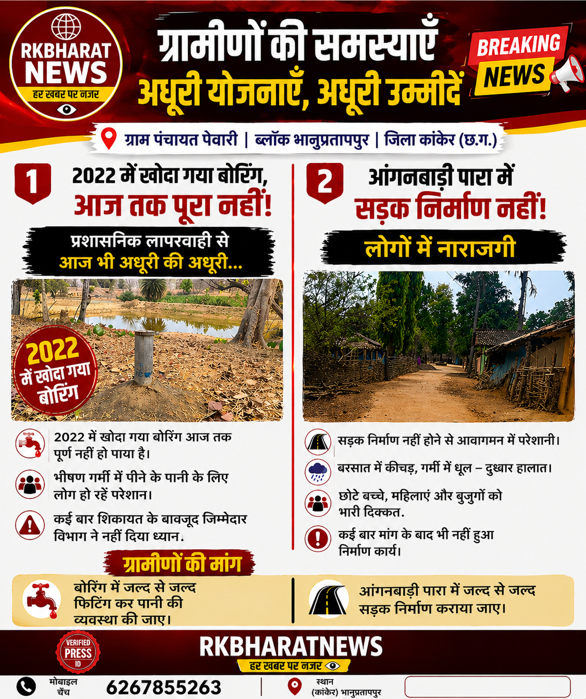 सड़क नहीं बनने से आंगनबाड़ी पारा के लोग नाराज इसी पंचायत के आंगनबाड़ी केंद्र क्रमांक 03 (आंगनबाड़ी पारा) में सड़क निर्माण नहीं होने से ग्रामीणों में भारी नाराजगी देखने को मिल रही है।बरसात के समय यह रास्ता कीचड़ से भर जाता है और गर्मी में धूल उड़ती है, जिससे छोटे बच्चों, महिलाओं और बुजुर्गों को भारी परेशानी का सामना करना पड़ता है।ग्रामीणों का आरोप है कि कई बार मांग करने के बाद भी अब तक सड़क निर्माण नहीं किया गया।