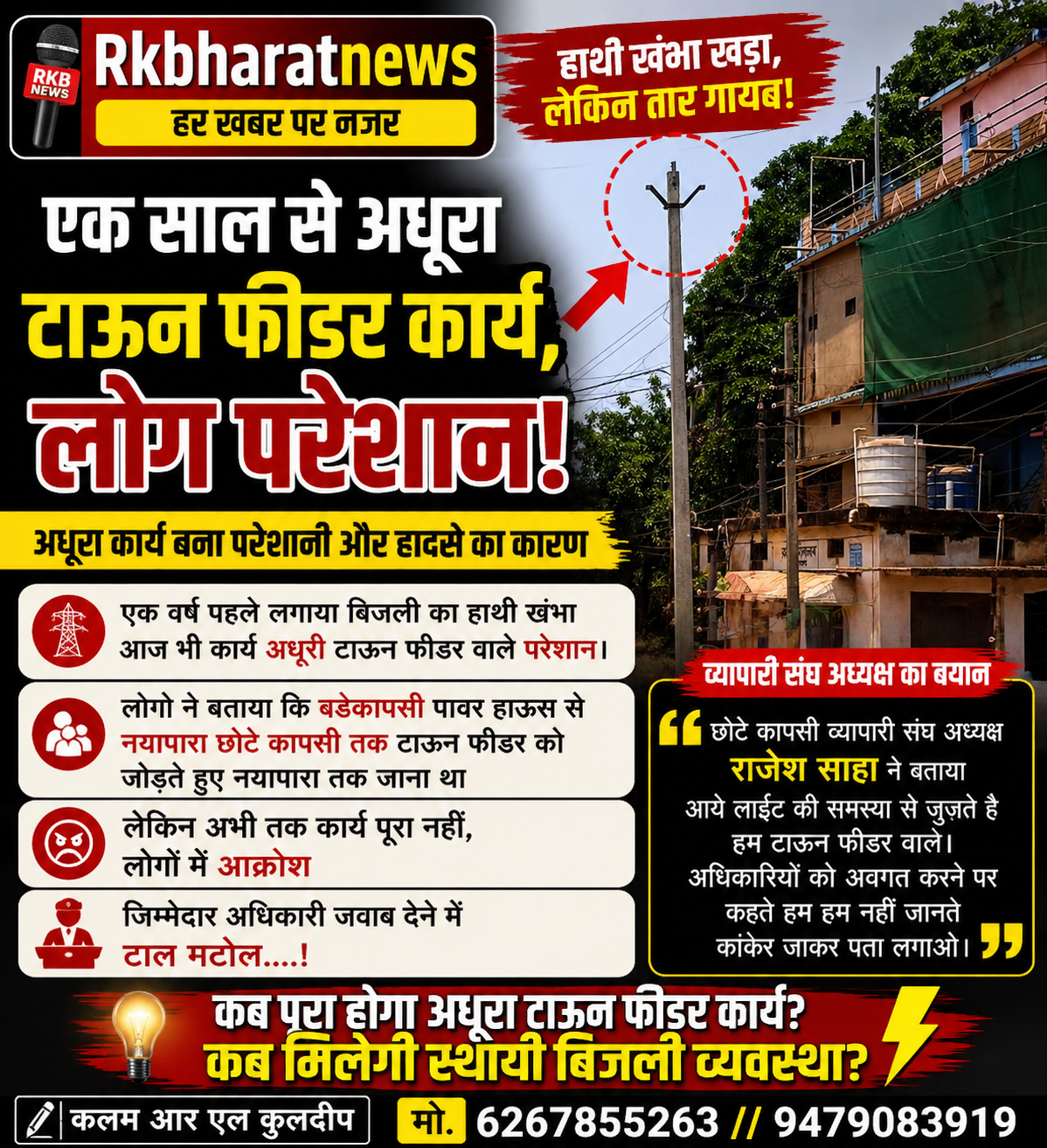 एक साल से अधूरा टाऊन फीडर कार्य, बिजली समस्या से जूझ रहे लोग ….खड़ा है ‘हाथी खंभा पर तार गायब — हादसे को खुला न्योता!