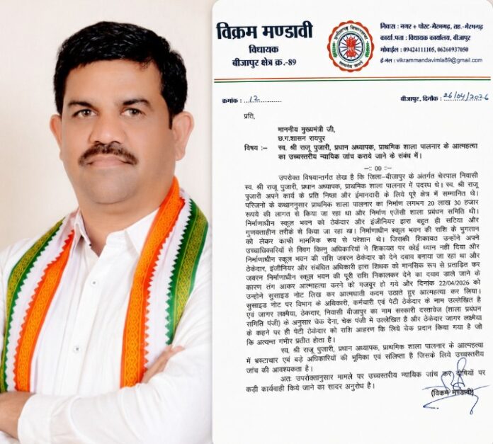 बीजापुर के विधायक विक्रम मंडावी ने रविवार को प्रदेश के मुख्यमंत्री विष्णुदेव साय को एक पत्र लिखा है।