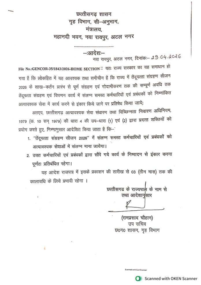 इस संभावित हड़ताल से तेंदूपत्ता संग्रहण कार्य प्रभावित होने और शासन को करोड़ों रुपये के नुकसान की आशंका जताई जा रही थी। स्थिति की गंभीरता को देखते हुए छत्तीसगढ़ शासन ने त्वरित कदम उठाते हुए 29 अप्रैल 2026 को अहम आदेश जारी किया है।