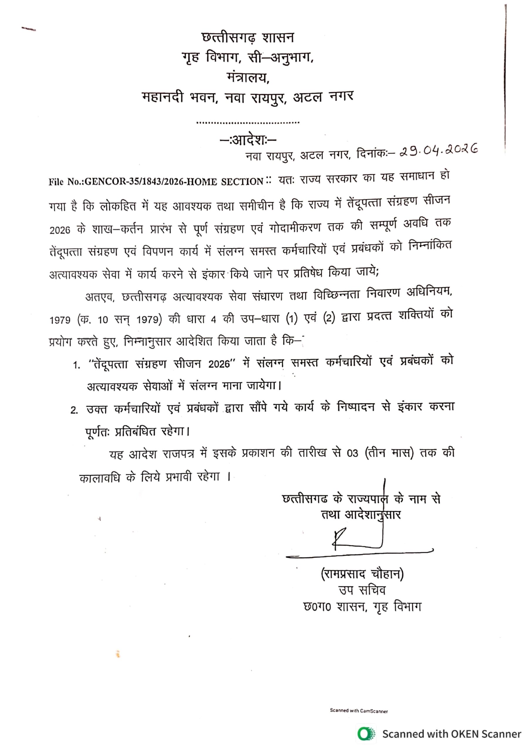 तेंदूपत्ता संग्रहण सीजन 2026 में संलग्न सभी कर्मचारी एवं प्रबंधक अब अत्यावश्यक सेवाओं के अंतर्गत माने जाएंगे।