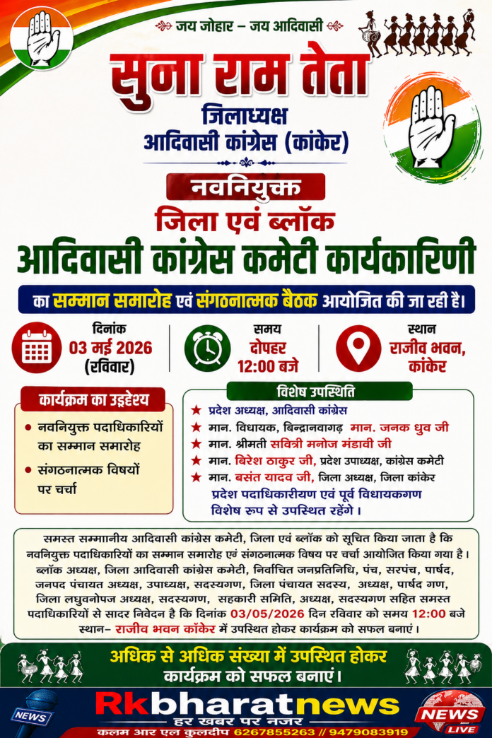 नवनियुक्त जिला एवं ब्लॉक आदिवासी कांग्रेस कमेटी कार्यकारिणी की राजीव भवन कांकेर में होगी अहम बैटक।