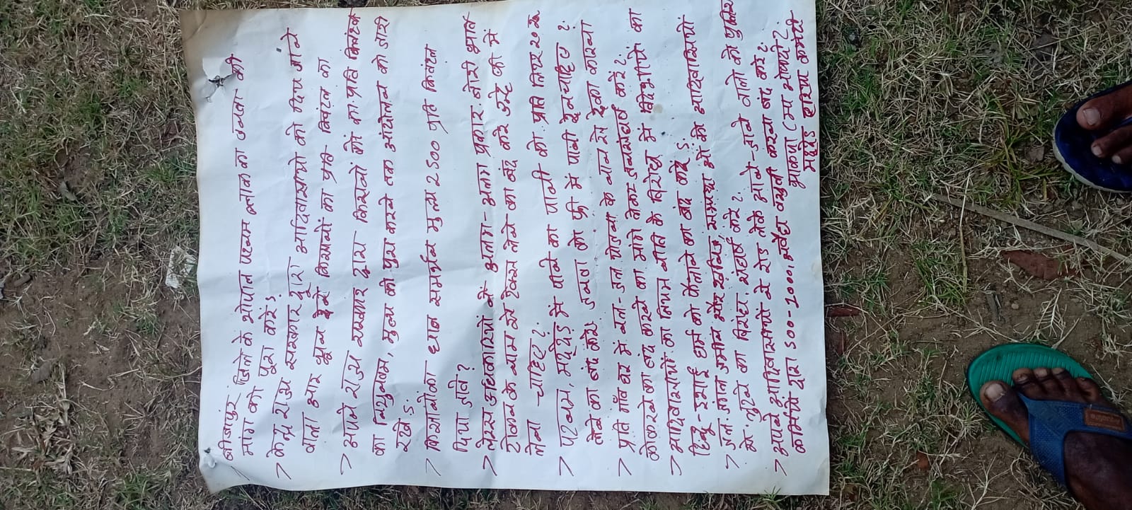 पर्चे में उल्लेख है कि आदिवासी जनता पर जबरन जुलुम दबाव हत्याकांड का निंदा करो। आदिवासियों का जल जंगल जमीन अनमोल खनिज संपदा उनको लूटने के लिए नए-नए कैंप पुल पुलिया खोलकर जनता को विस्थापित कर विदेशी साम्राज्यवादी फायदों के लिए पुलिस छावनी और आदिवासियों पर जबरन दबाव के कारण उनको परेशानियों का सामना करना पड़ रहा है ।यही केंद्र राज्य सरकार का विनाश विकास है। विगत दिनों बीजापुर जिले के थाना कैंपों को खोल कर उसके आसपास के गांव के सर्चिंग के नाम पर जाकर जनता के ऊपर यौन शोषण करना मारपीट यातनाएं देने के कारण मौत की घटनाएं हो रहे हैं। आवापल्ली थाना के अंतर्गत कई ऐसी घटनाएं हुई हैं जिसमें मारपीट बाजार आने जाने वालों को प्रताड़ित करना वाह पैसा वसूल ना कैंपों के आसपास रहने वाले गांव वालों को परेशान करना कैंपों में बुला बुला कर टार्चर करना जेल भेजना। ओयाम मगू को और कुंजाम शुकलू को जेल भेजा गया जेल से वापस आने के बाद इनकी मृत्यु हो गई। सरकार इनको उनके परिवार वालों को 2। 2 करोड़ रूपया मुआवजा दिया जाए। इस घटना का न्यायिक दंडाधिकारी से जांच होना चाहिए। हम अपील करते है। सभी उत्पीड़ित मानव अधिकार कार्यकर्ताओं सामाजिक कार्यकर्ताओं जनवादी बुद्धिजीवी वकीलों सर्व आदिवासी समाज छात्र बेरोजगारी कर्मचारी आंगनबाड़ी कार्यकर्ताओं इस घटना को खड़ी से विरोध करते हुए विशाल जन संघर्ष तेज करने करो। केंद्र राज्य सरकार द्वारा आदिवासियों को दिए जाने वाला आरक्षण को किया जाना चाहिए। किसानों का प्रति क्विंटल धान का समर्थन मूल्य देना चाहिए। बढ़ाना चाहिए। लेप्स अधिकारियों को अलग-अलग चोरी से टोकन के नाम से टेक्स लेना बंद करना चाहिए ।भोपालपटनम मद्देड में ₹20 में पानी बेचना बंद कर फ्री में पानी दिया जाए। गांव-गांव घर-घर में नल जल योजना के अंतर्गत मुफ्त में पानी दिया जाए। आदिवासियों की नियम नीति के विरुद्ध में विदेशियों का हिंदू ईसाई धर्म को फैलाना बंद करें ।जल जंगल जमीन खनिज संपदा ओं पर आदिवासियों को लूटने वालों पर संघर्ष और विरोध करें। अपने आदिवासियों रोड से आने जाने वाले को पुलिस कर्मियों द्वारा 500 और हजार रुपया अवैध वसूल करना बंद करें।। यह पर्चे भारतीय कम्युनिस्ट पार्टी मद्देड एरिया कमिटी ने जारी की है।